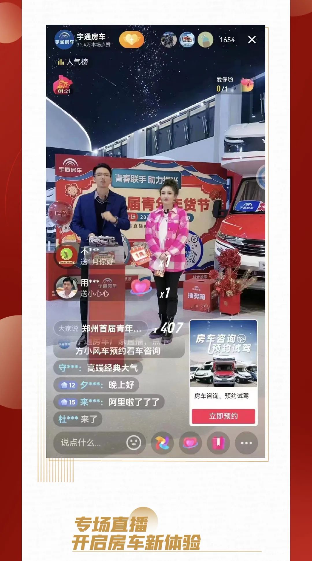 临近春节,由共青团郑州市委、郑州市商务局、河南职业技术学院创新创业中心、郑州市青联联合主办,宇通集团参与协办的“青春联手.助力振兴”——郑州首届青年年货节活动正在火热进行中,宇通房车代表宇通集团重点高端产品出战抖音直播,共同为传播美好房车生活、振兴房车旅游经济发展聚势赋能。