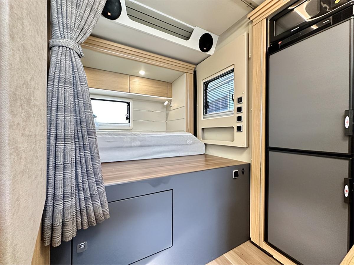 干湿一体式卫浴区配备了淋浴花洒、毛巾架、浴室镜、卫浴帘、洗手池、晾衣杆、穿衣镜、扶手、置物架等,卫浴、洗漱设施非常齐全;内部还有一台3kg洗烘一体机,解决旅行的洗衣问题。尾横床可拓展,拓展后尺寸为2210x1360mm,侧面阅读灯、电源插座、USB接口、车窗配备齐全,营造舒适的睡眠空间;顶部还有一排吊柜,提供充足的储物空间。
