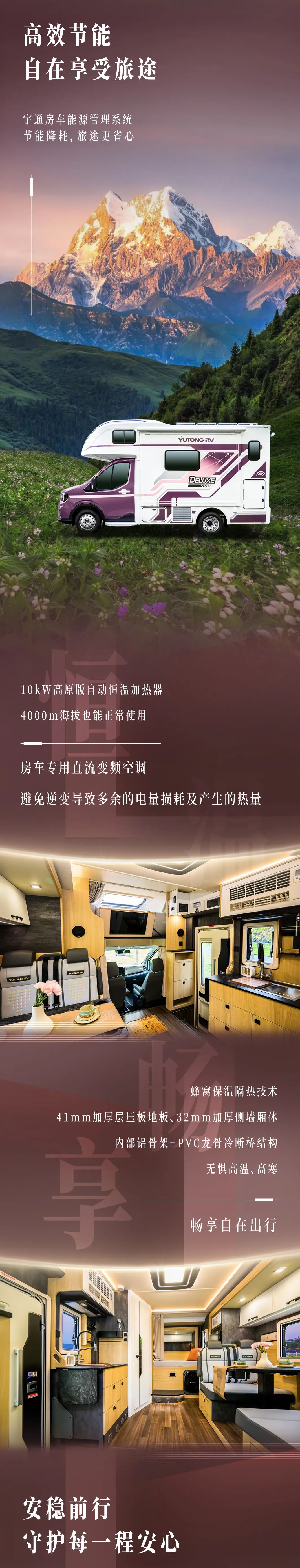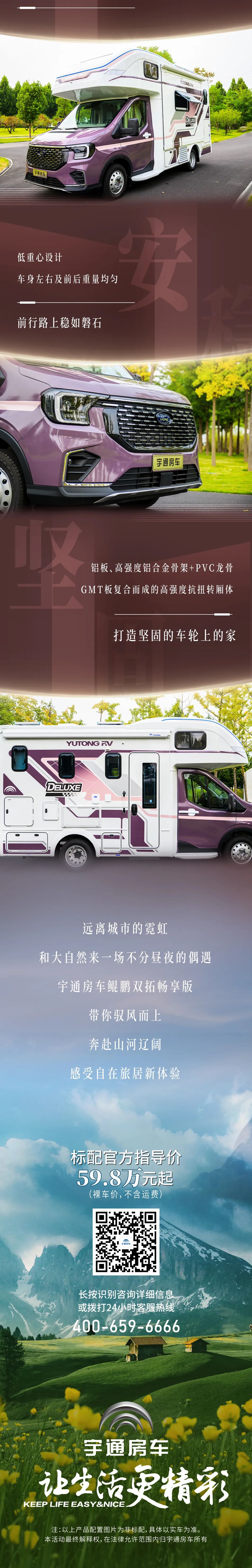 超大空间,从容奔赴山河,远离城市的霓虹,和大自然来一场不分昼夜的偶遇,宇通房车鲲鹏双拓展畅享版,带你驭风而上,奔赴山河辽阔,感受自在旅居新体验。宇通房车鲲鹏双拓畅享版,标配官方指导房车价格59.8万起(裸车价,不含运费)。