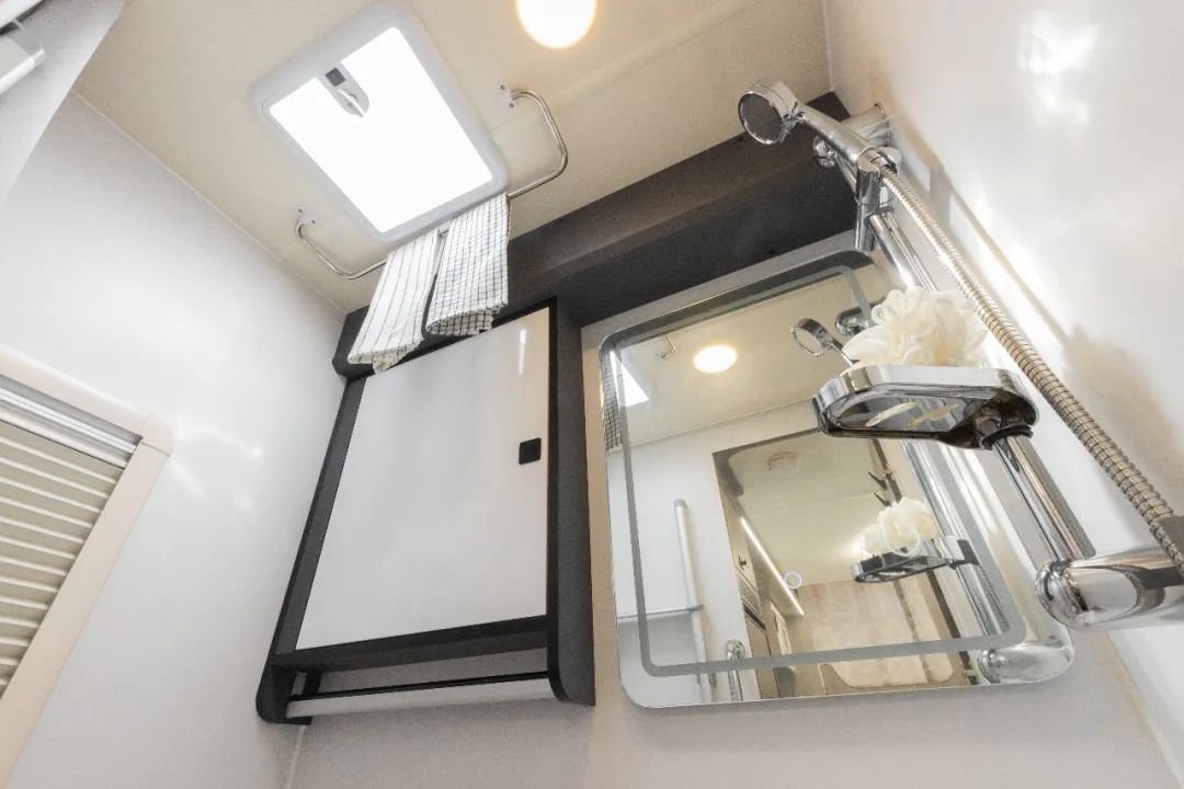 新型加水口离地高度更低,操作便捷,橱柜空间加大,配合抽拉式花洒,车外也能洗漱清洁。后行李舱空间、舱门加大,存取物品更方便。电器舱与地板分开,隔音效果更好。