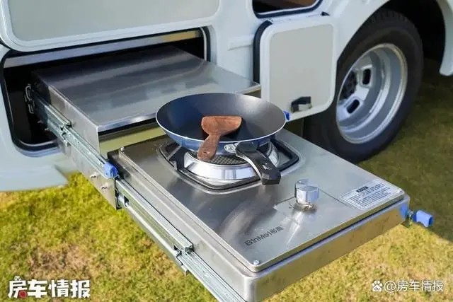 车身外部的户外设施比较齐全,厨房区配备了抽拉式的液化气灶,后期还可以选装柴油灶。基础烹饪需求得到了极大满足。而且手动遮阳棚还有灯带设计,实用性和美观性都还不错。外置置物板可以放置食材和调料,双向抽屉外侧安装了车外取水口,洗菜、烹饪一条龙~